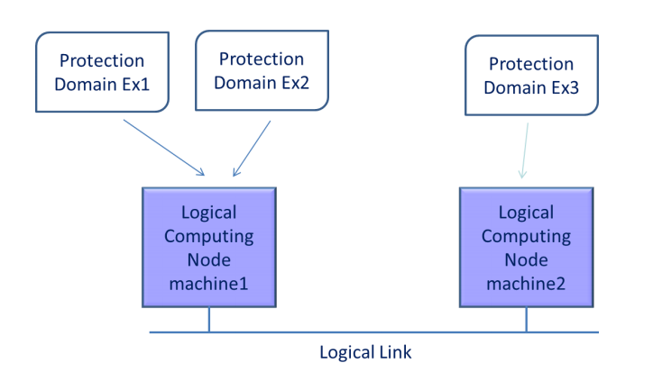 An example of a Logical System is shown in the figure opposite. It depicts machine1 connected to machine2 by a Logical Link. On machine1 there are 2 Protection Domains and on machine2 there is only one. On machine1 there must be a segregation mechanism at operating system level; whereas machine2 does not require this because it is only executing a single Protection Domain.